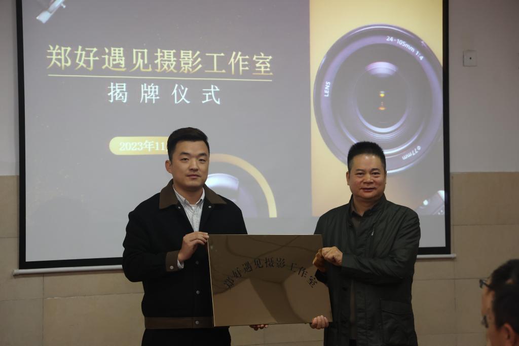 图为:经理王洪海教授为“郑好遇见”摄影工作室颁授标志牌