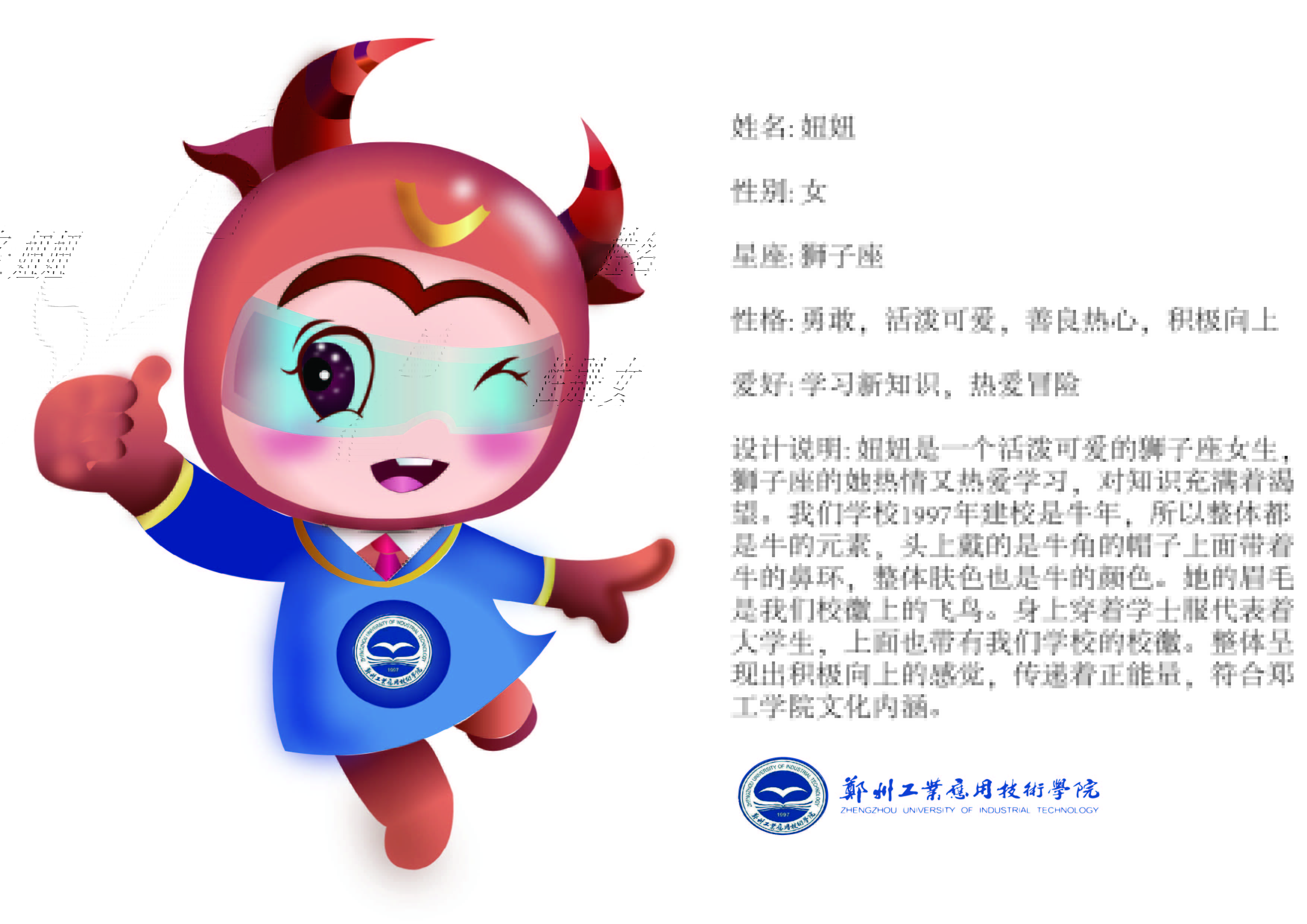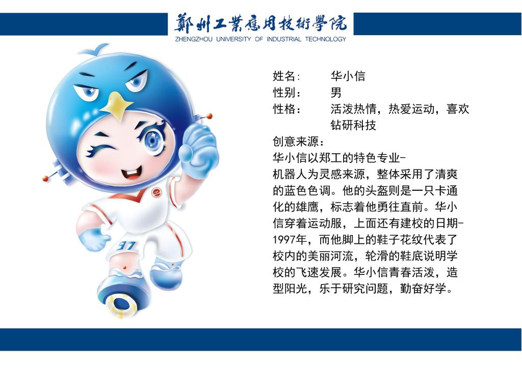 本次吉祥物设计员工以人物、动物、植物为原型,从公司校徽----鸿鹄、牛、公司特色建筑、以及黄帝文化“有熊氏”——熊为主体元素进行形象造型设计,生动讨喜、形象鲜明、辨识度高、具有亲和力。体现新时期郑工公司“励学、敦行、明理、至善”的校训精神、“厚德敬业 求是致用”的校风精神和“永不言弃、永不言败、永不言悔”的郑工精神等,更展示郑工公司25年的办学实力和成果并对下个25年进行展望。
