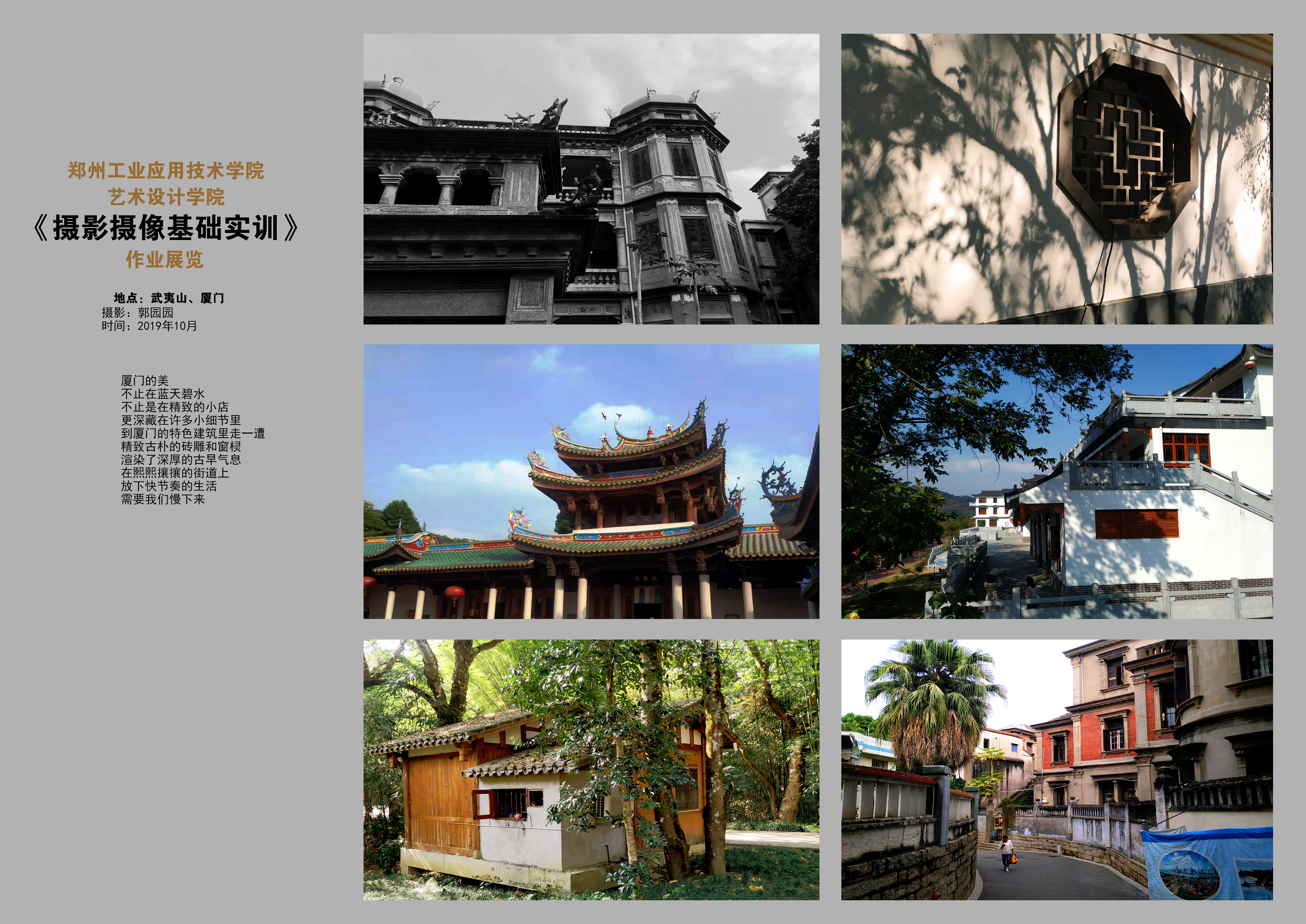据悉,2019年10月21日-30日,根据教学需要,按照教学计划,拓展员工视野锻炼员工摄影摄像技能,公司组织365VIP英国上市官网2018级视觉传达专业赴福建武夷山、厦门等地开展摄影摄像基础实训。本次实训加深了员工对我国南方沿海各类艺术形式及艺术特色的了解,培养员工从各种艺术形式中发现美的能力,掌握其他艺术形式的特点,从中吸取精华,为后续学习积累素材,为以后的专业课程学习奠定了良好的基础。同时,公司对本次集中实训的考核形式进行了改革,变之前的实习报告为摄影摄像作品展,实施“以展代考”,以实践成果来检验员工对基本知识、基本技能的掌握程度,全面考核员工的实践应用能力。