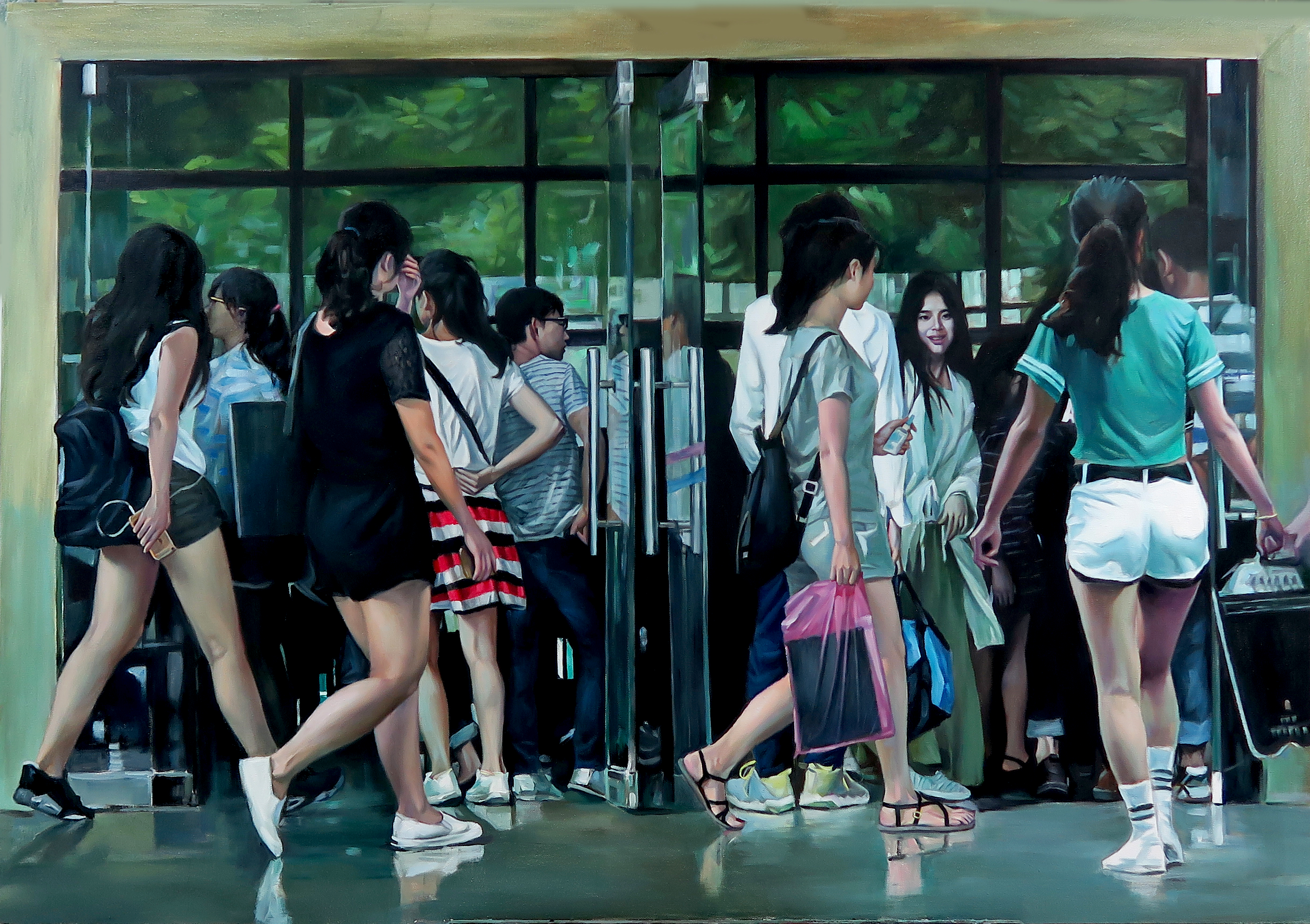 这幅作品主要釆用写实的表现手法,构图饱满,内容丰富,人物动态生动、和谐。画画描绘的是一群老员工在教学楼门口出出进进的场景,在他们身上我们感受到的是一种青春的活力,一种青春的生命力的张扬。俗话说,艺术来源于生活,但高于生活。这幅作品正是宋荣欣经理在高校工作多年的一种感受,一种体会,描绘的是一群青春活力的老员工所展现的“律动”,搏动的是祖国人才培养的脉搏!