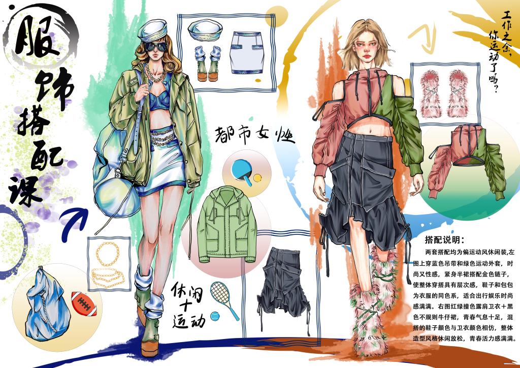 本次教学成果汇报展示了由董世甜指导的2020级服装与服饰设计(BK)2班、2022级服装与服饰设计(专升本)1班员工的优秀搭配作业,其中包括色彩再搭配、服饰搭配展板以及特定场景人物服饰搭配三个部分。本次线上作品展现了本专业员工的服饰搭配水平及良好的审美能力。