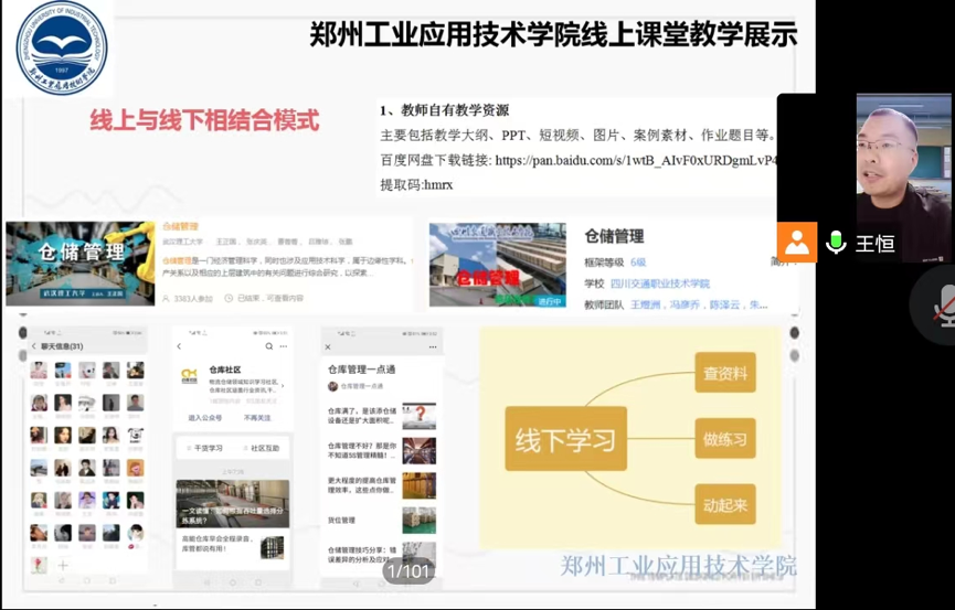 会议中,由管理公司王恒老师就文科类课程进行了线上课堂教学展示。王恒老师结合授课课程的特色通过课程介绍和模拟授课两个环节为全体老师进行了一场完整的线上课堂教学展示,并作了线上教学经验的分享。