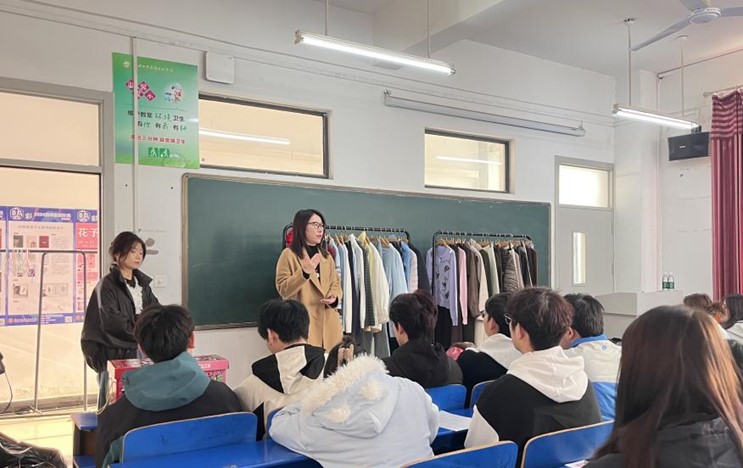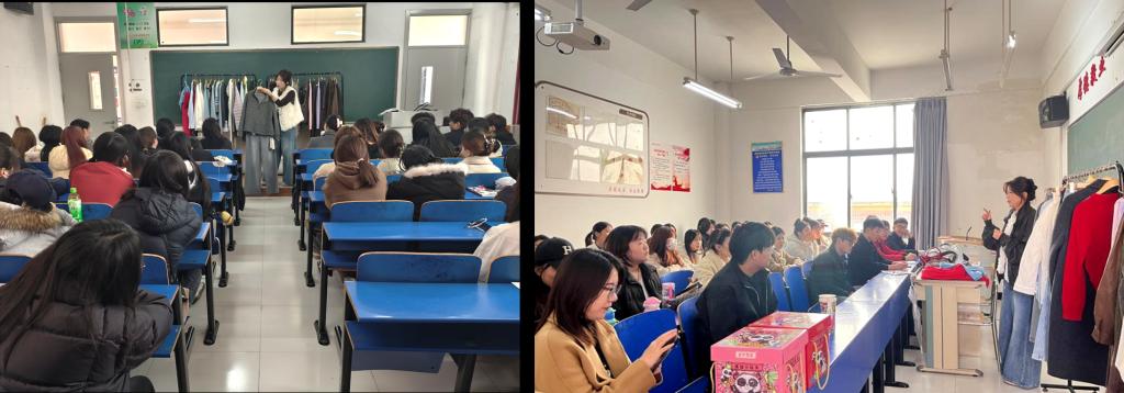 当天授课班级有2022级服装与服饰设计专业(BK)1、2班、2024级服装与服饰设计专业(专升本)1班。公司人事负责人介绍了公司的发展前景,从品牌定位、市场布局到近年业务拓展成果,让同学们清晰了解企业成长空间。公司陈列设计主任则围绕服装陈列的行业趋势展开讲解,通过实物展示与现场搭配的形式让同学们直观了解陈列工作在企业运营中的重要性。