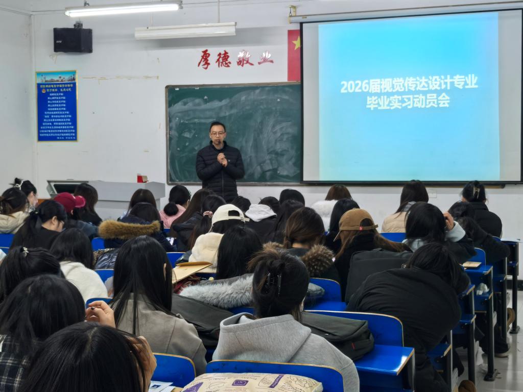 (图/刘天奇文/陈艳)11月20日下午,视觉传达设计专业2026届本科毕业实习动员大会在艺406教室圆满举行。本次大会旨在扎实推进毕业实习这一关键实践性学习环节,为毕业生实习及后续就业工作筑牢基础。教研室主任李根启、副主任刘天奇、部分实习指导教师及116名2026届本科毕业生参会,大会由李根启主任主持。