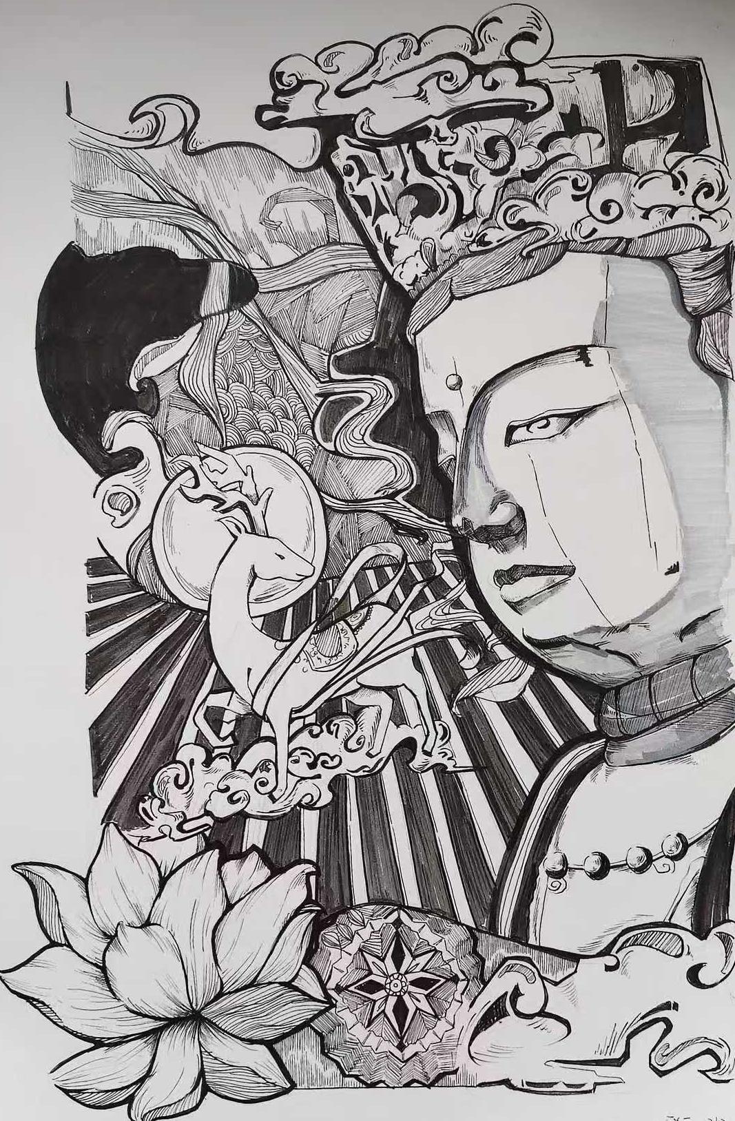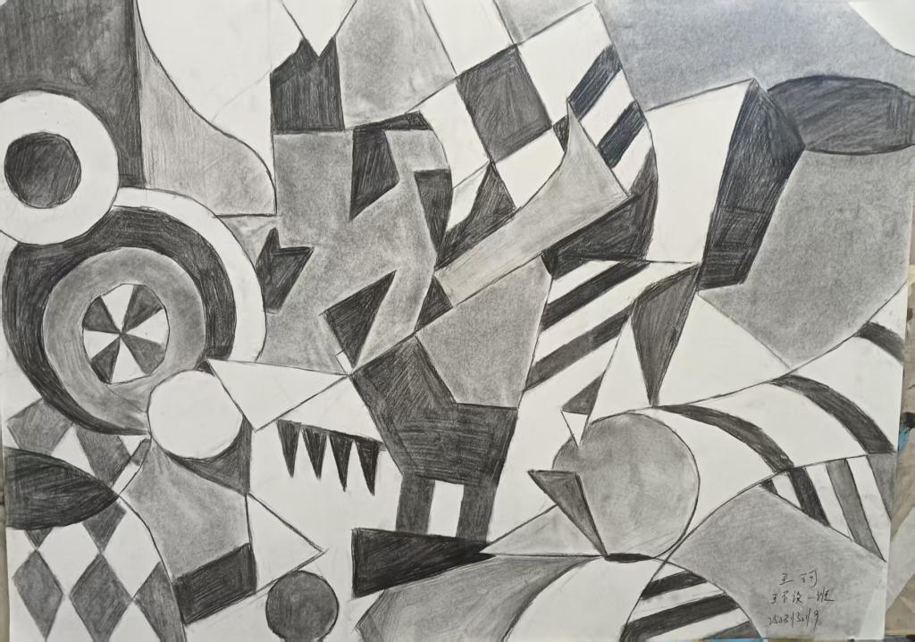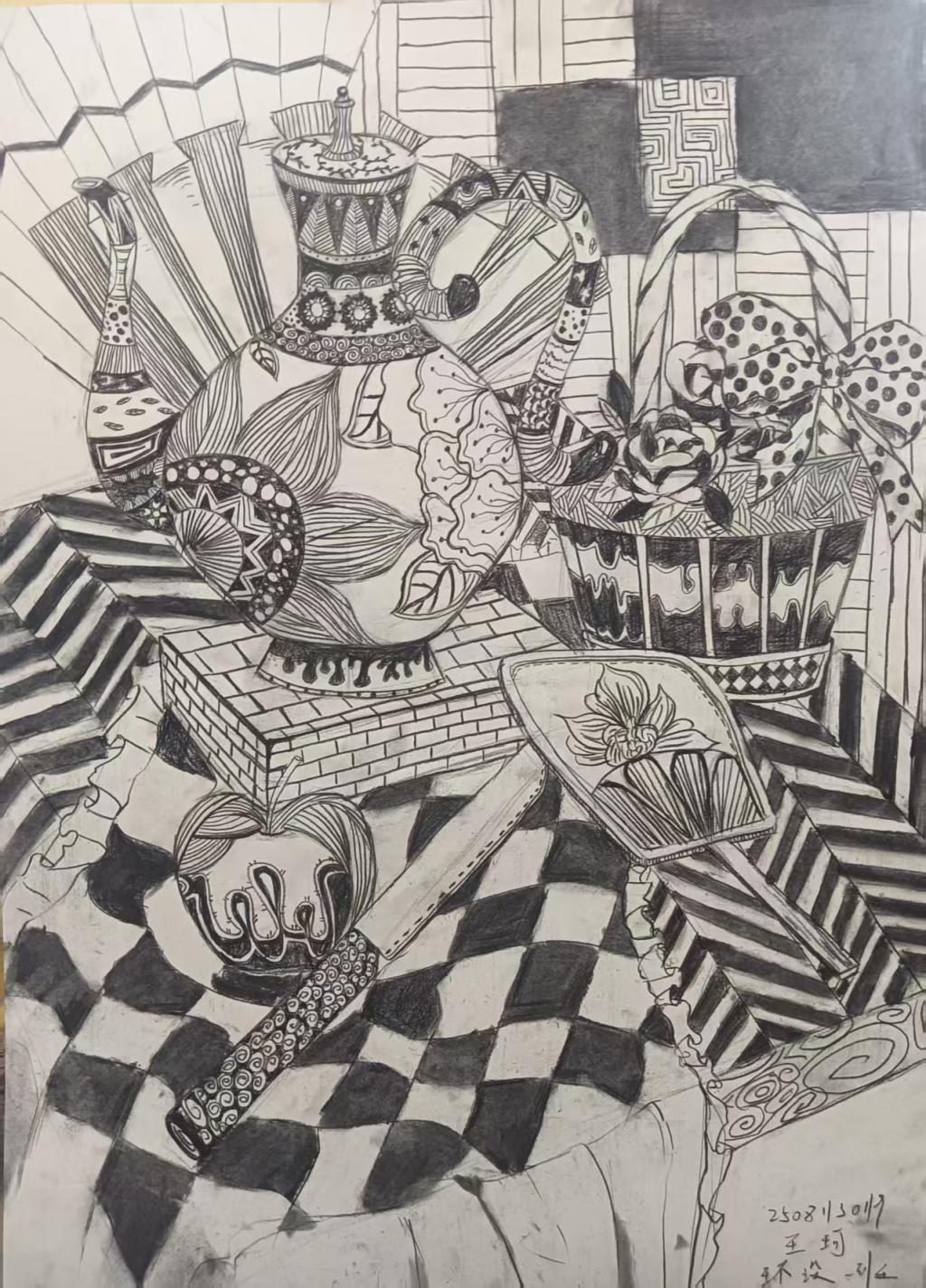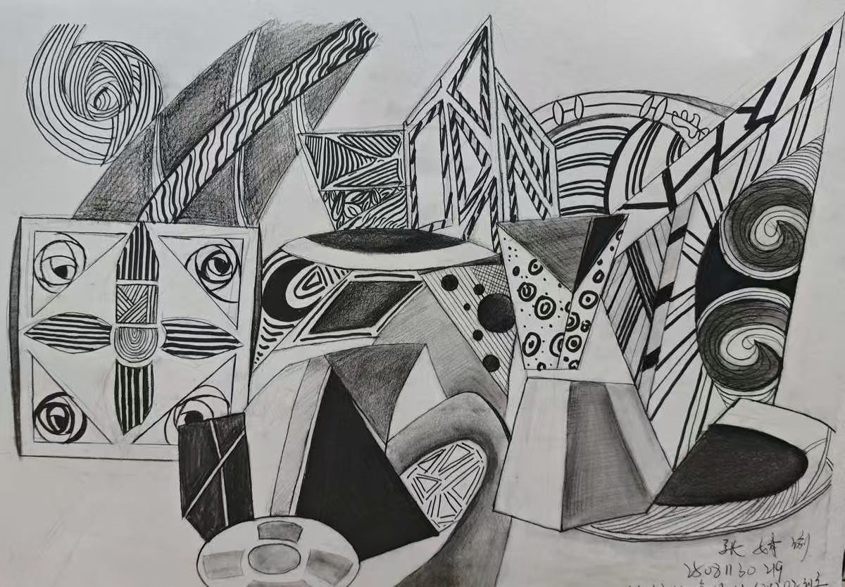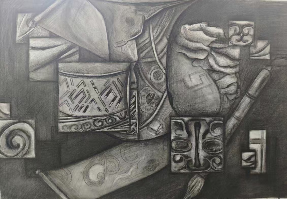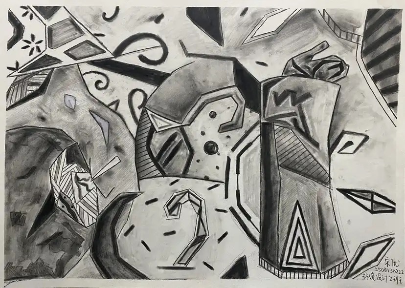 本次展出的作品,有的聚焦传统审美纹样,从传统绘画中提取设计元素,赋予素描作品别样的装饰美感;有的大胆突破写实边界,通过夸张、变形与重组的手法,将日常物件转化为充满想象力的设计雏形;还有的大胆尝试抽象表达,用极简的笔触勾勒出充满韵律感的画面。一笔一画皆是思考,一纸一墨尽是创意,每一幅作品都是同学们观察能力、思考能力与动手能力的结晶,这些作品不仅是技法的凝练,更是同学们设计思维的萌芽。