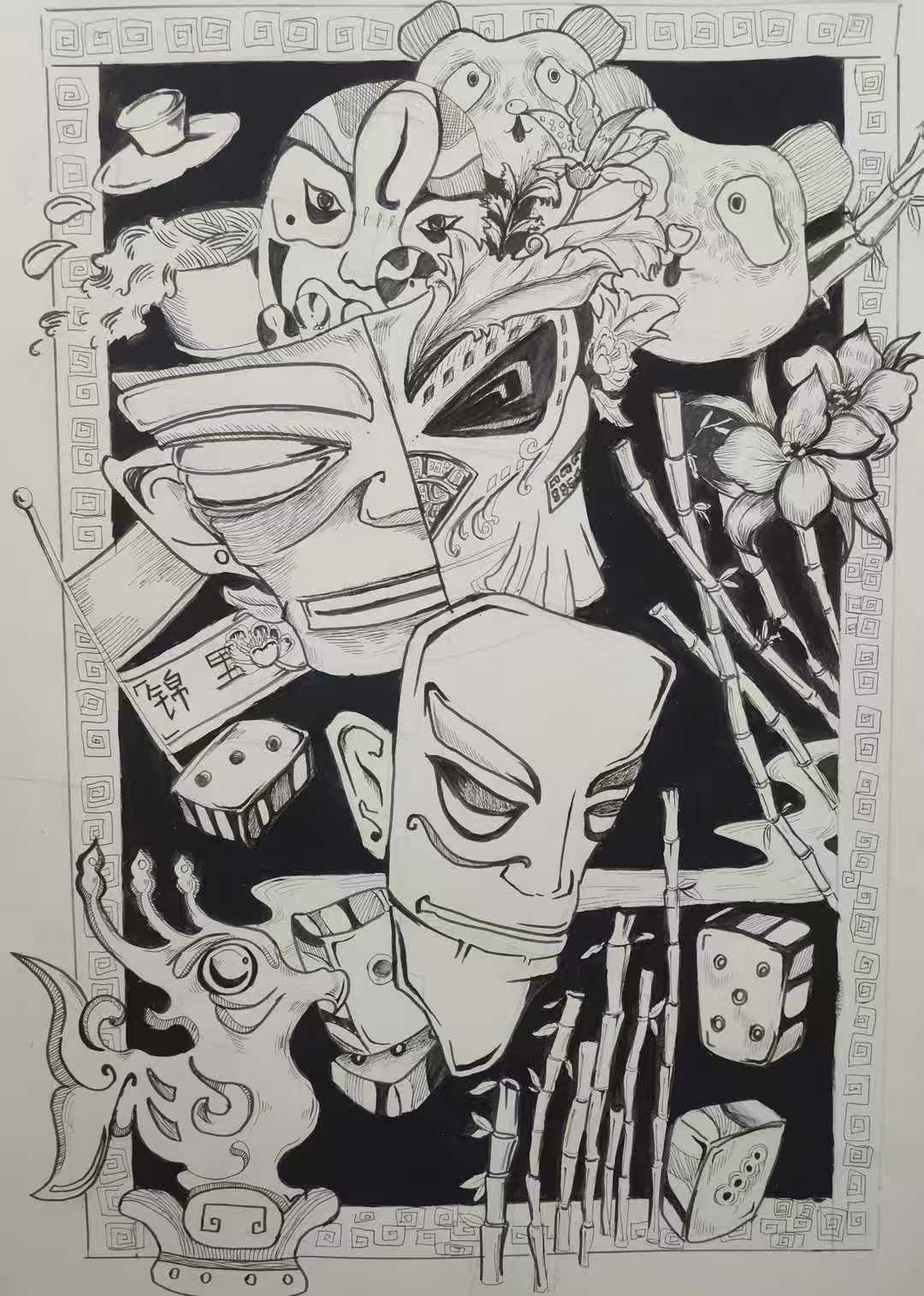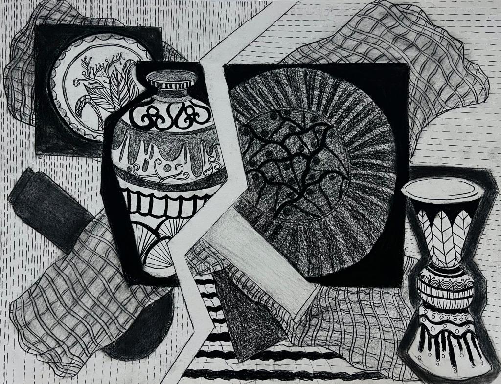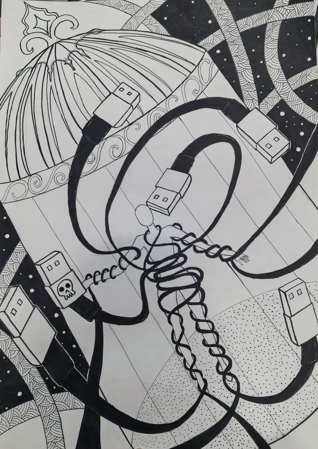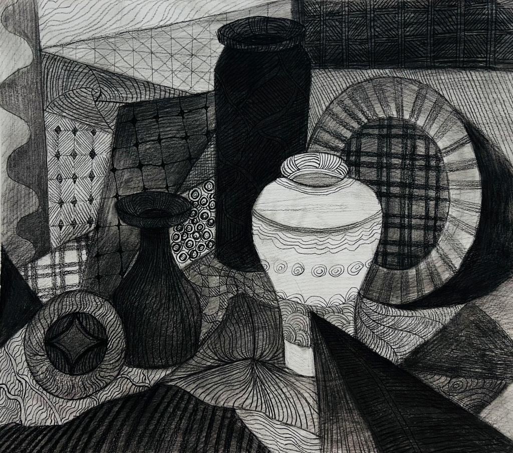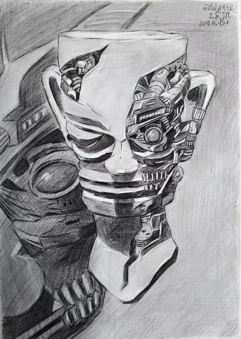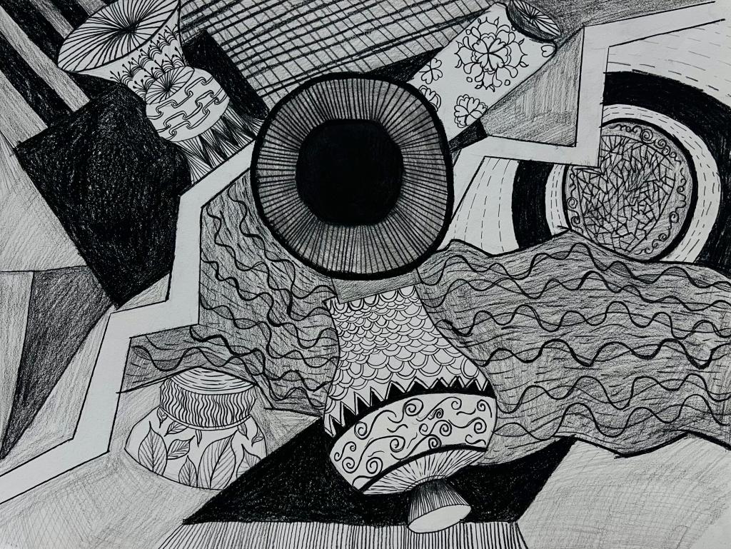 本次展出的作品,有的聚焦传统审美纹样,从传统绘画中提取设计元素,赋予素描作品别样的装饰美感;有的大胆突破写实边界,通过夸张、变形与重组的手法,将日常物件转化为充满想象力的设计雏形;还有的大胆尝试抽象表达,用极简的笔触勾勒出充满韵律感的画面。一笔一画皆是思考,一纸一墨尽是创意,每一幅作品都是同学们观察能力、思考能力与动手能力的结晶,这些作品不仅是技法的凝练,更是同学们设计思维的萌芽。
