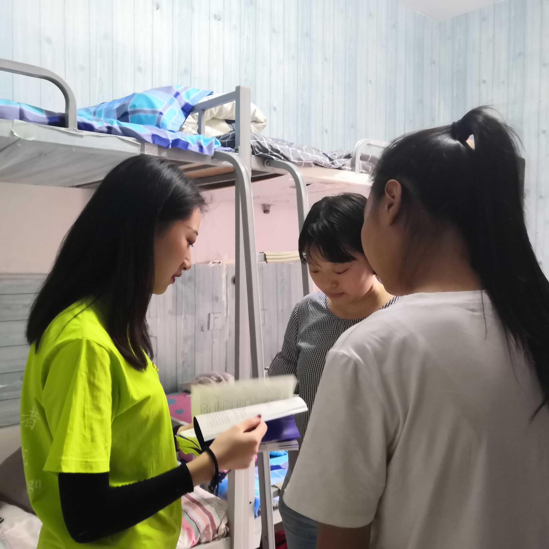 通过进宿舍活动向员工宣传党的宗教政策法规,防范和抵御境内外宗教向校园渗透,筑牢“校园不传教、员工不信教”的坚强思想防线。通过教育使员工懂得为什么不能信教、不能参加宗教活动,提醒员工不能在校内外穿戴反映宗教信仰的服饰、标志等。引导和教育员工努力学习科学文化知识,树立正确的世界观、人生观、价值观。
