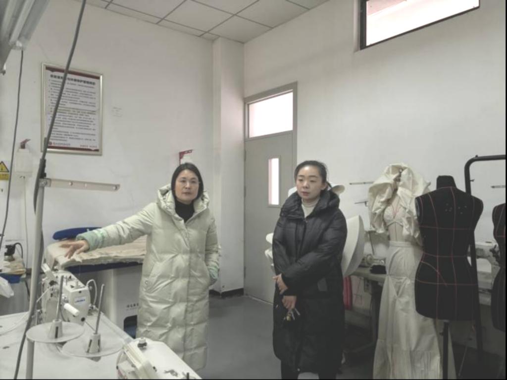 图为张凡副经理带队检查服装工艺实训室