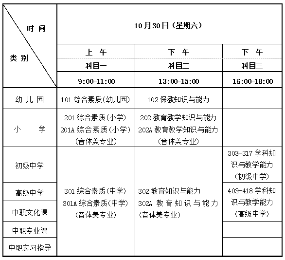 (二)小学类别面试 “心理健康教育”“信息技术”“小学全科”学科,笔试科目一、科目二在笔试报考时选择相应的公共科目201、202;初中、高中、中职文化课类别面试 “心理健康教育”“日语”“俄语”学科,笔试科目一、科目二在笔试报考时选择相应的公共科目301、302,笔试科目三《学科知识与能力》结合面试一并考核。
